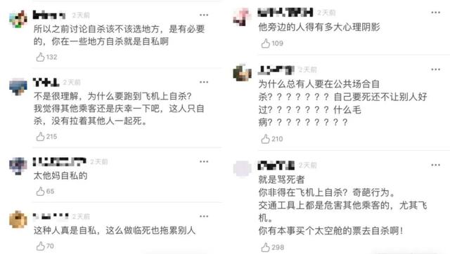 ▲網(wǎng)友評論自殺者“自私”(圖/網(wǎng)絡(luò )) 據悉,國航方面尚未就此事作出回應,警方已經(jīng)介入調查。但此事已在網(wǎng)上引起了熱議,其中有不少網(wǎng)友還紛紛譴責死者,稱(chēng)他“自私”“行為奇葩”。 01 現代社會(huì ),自殺是一種較為普遍的社會(huì )現象。世界衛生組織的統計表明,全球每年有80萬(wàn)以上的人死于自殺,還有更多的人企圖自殺。 因此,每年有數以百萬(wàn)計的人經(jīng)歷自殺帶來(lái)的喪親之痛或受此影響。自殺在整個(gè)生命過(guò)程中都有可能發(fā)生,是2012年全球15-29歲人群的第二大死因。 前幾年有一組統計數據顯示,全球自殺率最高的國家是南美洲的圭亞那,達到每10萬(wàn)人中有40人以上自殺,這一數據高出世界平均水平4倍。 排名第二的是中國,排名第三的是韓國。后面依次是斯里蘭卡、立陶宛、蘇里南、莫桑比克、坦桑尼亞、尼泊爾、哈薩克斯坦、布隆迪、印度、南蘇丹、土庫曼斯坦、俄羅斯、烏干達、匈牙利、日本、白俄羅斯、津巴布韋、不丹、蘇丹、科摩羅、烏克蘭、波蘭。 上述25個(gè)自殺率最高的國家,除了韓國和日本,要么是轉型動(dòng)蕩國家,要么是發(fā)展中國家,因此幾乎可以判定,經(jīng)濟利益的糾葛,是自殺的首要因素。